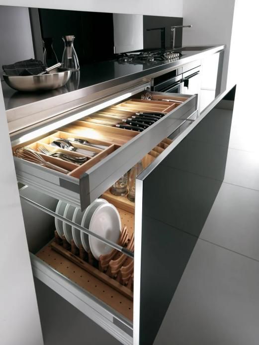 二、鍋碗瓢盆放地柜 現(xiàn)在市面上的地柜可大致劃分為掩門式和抽拉式,主要用來(lái)放置鍋具、餐具等大件廚房物品,也可以在內(nèi)嵌入洗碗機(jī)等家電。