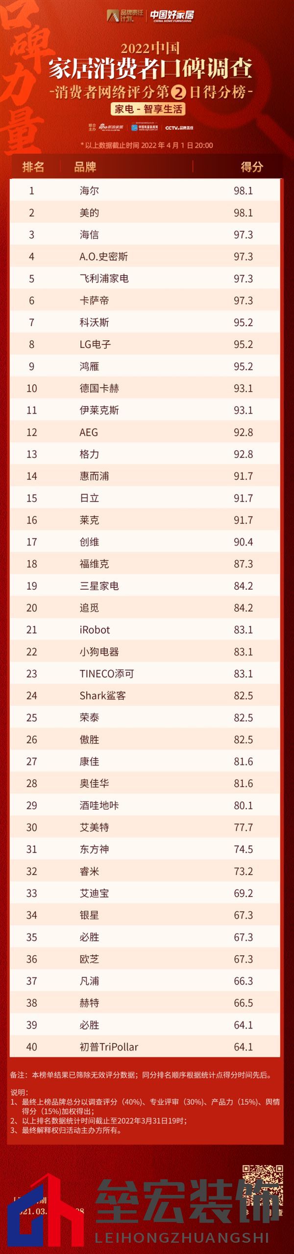 ??調(diào)查第二日,截至4月2日20時(shí),在家電行業(yè)智享生活品類消費(fèi)者口碑榜單中,海爾/美的以98.1分并列第一,海信/A.O.史密斯/飛利浦家電/卡薩帝則以97.3分緊隨其后。>>點(diǎn)擊查看品類得分榜單 ??此次參選家電-智享生活品類的品牌,分布在生活電器、廚房電器、舒適系統(tǒng)、清潔電器、個(gè)護(hù)小家電等各領(lǐng)域。這些品牌均在科技研發(fā)、智能家電拓展領(lǐng)域有著突出表現(xiàn)。譬如海爾智慧生活,倡導(dǎo)全場(chǎng)景互聯(lián)互通,A.O.史密斯以自主研發(fā)的AI-LiNK系統(tǒng)實(shí)現(xiàn)全屋風(fēng)水冷暖專業(yè)集成。今日末三位為赫特,必勝,初普TriPollar,由于部分品牌為新增參調(diào),因此這些品牌的后續(xù)得分依然值得期待!