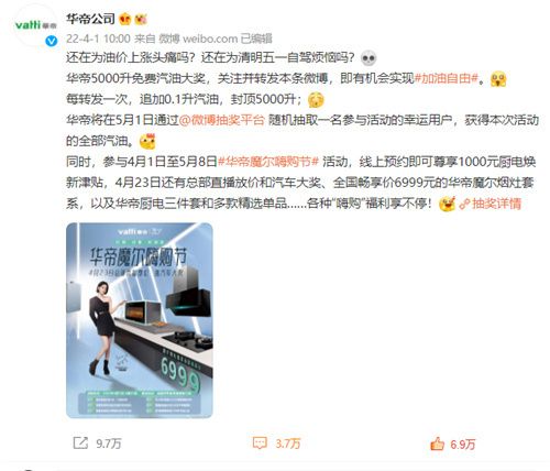 華帝#加油自由#官方微博活動(dòng)資料顯示:華帝承諾,只要關(guān)注華帝官方微博并轉(zhuǎn)發(fā)該活動(dòng)話題,每轉(zhuǎn)發(fā)一次,華帝追加 0.1 升汽油,封頂 5000 升(價(jià)值49500元),相當(dāng)豪橫!華帝將在 5 月 1 日通過微博抽獎(jiǎng)平臺(tái)隨機(jī)抽取一名參與活動(dòng)的幸運(yùn)用戶,獲得本次活動(dòng)的全部汽油,想要實(shí)現(xiàn)“加油自由”的小伙伴們,絕對(duì)不容錯(cuò)過! #加油自由#是華帝魔爾嗨購節(jié)活動(dòng)中的一個(gè)福利,該活動(dòng)于4月1日啟動(dòng),截止5月8日。活動(dòng)期間,用戶線上預(yù)約即可尊享 1000 元廚電煥新津貼、華帝魔爾煙灶套系全國暢享價(jià)只要6999 元等福利;此外,4月23日華帝魔爾嗨購節(jié)還將啟動(dòng)“總部直播放價(jià)抽汽車大獎(jiǎng)”活動(dòng),包括1元搶購,千元補(bǔ)貼、萬元紅包、超值加贈(zèng)、汽車大獎(jiǎng)等一系列“嗨購”福利……