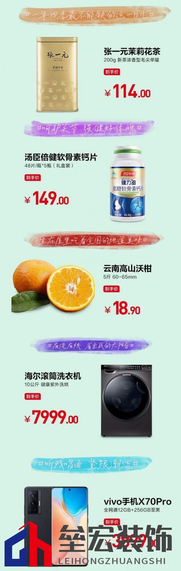 ??416大促期間,真快樂APP為爸媽挑選心水好物。對于愛好喝茶的爸爸,不妨送他們一罐張一元茉莉花茶,讓新茶濃香滿足他們的味蕾感受,現(xiàn)在真快樂APP活動價僅需114元;經(jīng)常手洗衣服的媽媽,最值得為她入手一臺海爾10公斤滾筒式洗烘一體洗衣機(jī),一鍵洗凈,不用晾曬,7999元的價格,就可以解放媽媽的雙手,讓她們有更多的私人空間;對于還在用老年機(jī)的父母,不妨送他們一臺vivo X70 Pro 手機(jī),這樣以后想他們了,還可以視頻連線遠(yuǎn)程看看他們在家過得好不好,僅需3899元,就能讓父母緊跟潮流,暢享智能時光;父母年紀(jì)大了,風(fēng)濕關(guān)節(jié)問題總難免,備上一瓶湯臣倍健軟骨素鈣片,5瓶禮盒裝只要149元,每天一片,輕松吃上8個月,讓父母遠(yuǎn)離骨質(zhì)疏松!