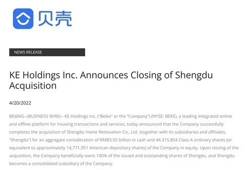 | 4月20日晚間,貝殼找房(后文簡稱“貝殼”)宣布正式完成對家裝家居品牌圣都家裝(后文簡稱“圣都”)的收購,收購?fù)瓿珊筘悮碛惺ザ?00%已發(fā)行和流通股權(quán),同時(shí)圣都正式成為貝殼的合并子公司。本次收購貝殼所花費(fèi)的總代價(jià)為人民幣39.2億元現(xiàn)金和44,315,854股公司A類普通股(或相當(dāng)于約14,771,951股美國存托股份)權(quán)益。