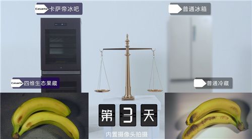 實驗中,工作人員將兩份香蕉放在天平上,顯示香蕉重量相同,隨后工作人員又分別放入卡薩帝冰吧暖藏和普通冰箱的冷藏空間中。3天后,工作人員將兩份香蕉取出,分別放在天平兩側(cè),顯示卡薩帝冰吧向前者傾斜,也就是說卡薩帝冰吧中的香蕉比普通冷藏的香蕉重。