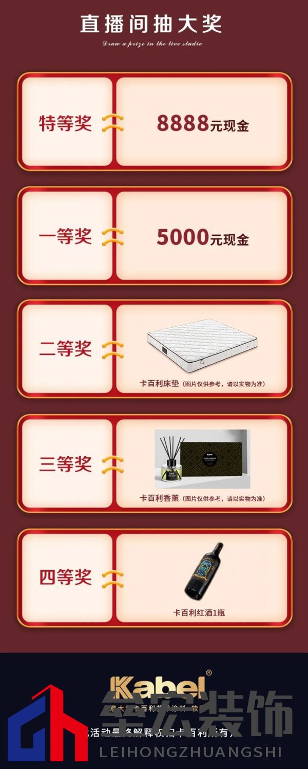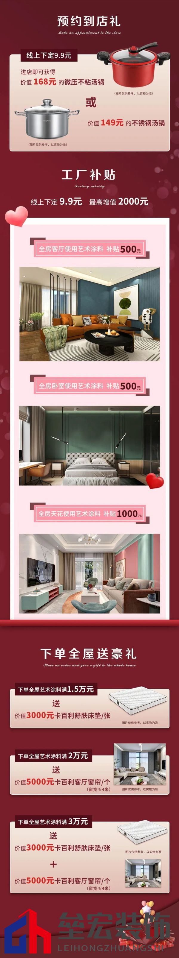 送禮清單 你裝修,我們補貼!春季裝修正值火熱時間,一直耽擱裝修的業(yè)主朋友們,趁這個“卡百利520超級品牌日”有福利啦!一定不要錯過這次活動!卡百利工廠補貼,助力消費者安家入住。線上下定9.9元,最高增值2000元,進店還能獲得湯鍋好禮!下定全屋藝術涂料,消費滿即送床墊、窗簾一系列豪禮!