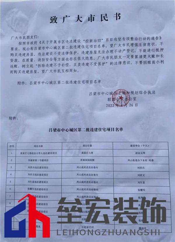 | 2022年4月26日,值山西呂梁違建拆除百日攻堅(jiān)行動(dòng)火熱開(kāi)展之際,呂梁市中心城區(qū)土地和規(guī)劃綜合執(zhí)法聯(lián)席會(huì)議辦公室再次發(fā)布致廣大市民書,書中就呂梁市中心城區(qū)第二批違建住宅項(xiàng)目名單進(jìn)行了公示,袁家莊七巷趙金元等人違建項(xiàng)目、美麗家園1號(hào)樓項(xiàng)目、劉世兵違法建設(shè)項(xiàng)目等11個(gè)違建項(xiàng)目赫然在列。 繼4月份百日攻堅(jiān)整治行動(dòng)以來(lái),第一批違建項(xiàng)目已在陸續(xù)拆除中,此次,第二批名單的公布再次表明了呂梁市人民政府對(duì)違建拆除的“零容忍“,其可持續(xù)的長(zhǎng)效機(jī)制,彰顯了呂梁市對(duì)拆除違建的信心和決心。