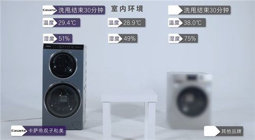 之所以產(chǎn)生這些情況,很大程度上是由于洗衣機(jī)內(nèi)筒潮濕造成的。實(shí)驗(yàn)視頻顯示,在外部溫濕度一致的情況下,將卡薩帝洗衣機(jī)和普通洗衣機(jī)同時(shí)啟動(dòng)洗衣,洗甩結(jié)束30分鐘后,普通洗衣機(jī)溫度依然達(dá)到38.0℃,濕度為75%。而卡薩帝洗衣機(jī)的溫濕度則基本恢復(fù)到與外部空氣的溫濕度相當(dāng)。