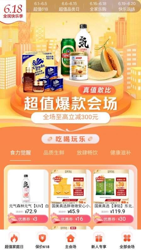 ??6.18大促折扣福利速覽 優(yōu)惠疊加輕松“樂購一夏” ??6月1日至20日,國美正式開啟以“真值6.18·樂購一夏”為主題的大促活動,16大會場爭相斗艷,12大類目帶來實惠津貼,熱門商品每滿200減35、滿299減30全民快樂券、熱銷爆款買一贈一、部分商品跨店滿199減100等多個專場活動輪番登場,以全網(wǎng)超低價和高品質(zhì),為你送上不套路、真快樂、真低價的全家樂購體驗。 ??此次活動品類涵蓋品質(zhì)家電、潮流3C、休閑食品、中外名酒等12大類目,每個品類都有福利爆品。其中,從6月1日至5日,真快樂APP將每日重點推出狂歡秒殺日、超值家庭日、萬店狂歡日、超值爆款日和超值會員日多個促銷活動,以敢比全網(wǎng)的低價回饋消費者,活動主會場好貨真5折、熱賣爆品、超值爆款、生活服務(wù)、九九會員等繽紛版塊,掀起低價狂潮。