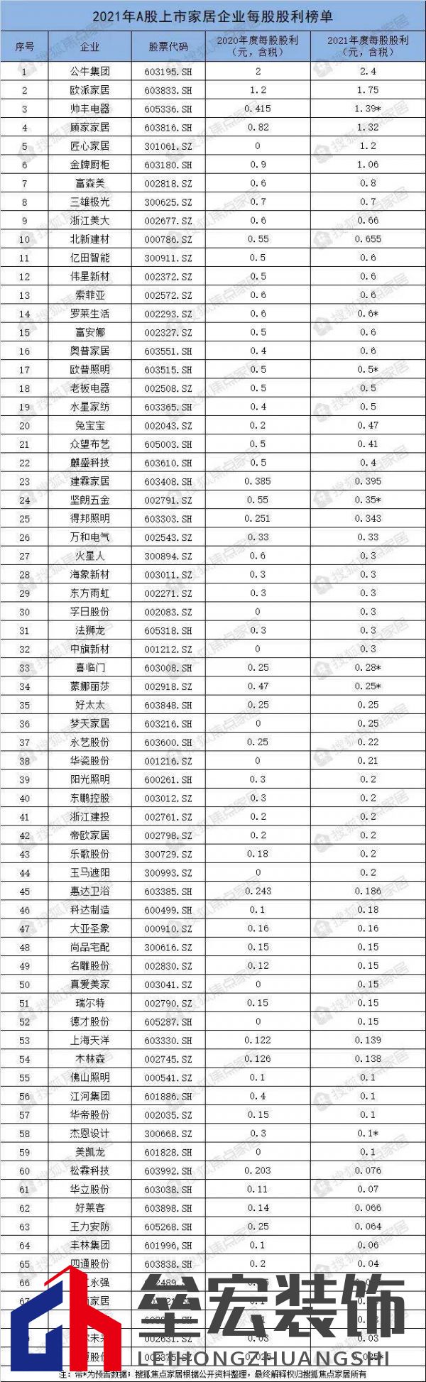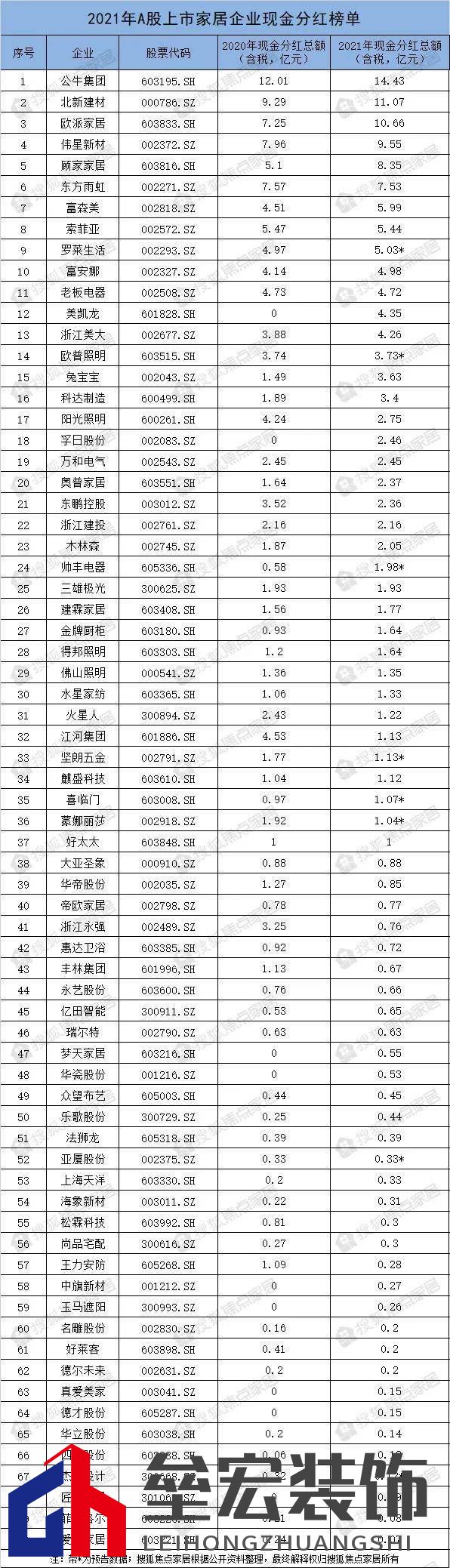 | 進入6月末,A股上市公司開始陸續(xù)分紅?,F(xiàn)金分紅作為實現(xiàn)投資回報的重要形式,是尊重和保護投資者權(quán)益的重要體現(xiàn)。隨著各企業(yè)2021年度權(quán)益分派實施公告的披露,上市公司現(xiàn)金分紅意愿如何,分紅金額有多少,成為被關(guān)注的熱點。  截至2022年6月22日,搜狐焦點家居根據(jù)公開資料,整理了70家A股上市家居企業(yè)年報披露的現(xiàn)金分紅計劃,從家居上市公司分紅情況,也可一窺當(dāng)前家居企業(yè)的實力情況。 合計超140億元 過半企業(yè)現(xiàn)金分紅總額過億 對于家居上市公司而言,隨著登陸A股的企業(yè)數(shù)量持續(xù)增多,累計分紅規(guī)模也有一定變化。 從分紅規(guī)???,據(jù)《2021家居A股上市企業(yè)現(xiàn)金分紅榜單》顯示,已收錄的70家上市家居企業(yè)中,現(xiàn)金分紅總額由2020年的138.11億增至2021年的141.5億元,數(shù)額有所增長但整體增幅不大;公牛集團以14.43億元的現(xiàn)金分紅總額仍然位居首位,其次為北新建材和歐派家居,分別達(dá)到了11.07億元、10.66億元;對應(yīng)其2020年營業(yè)收入,分別為123.85億元、210.86億元和204.42億元,就規(guī)模和影響力而言,均為家居行業(yè)內(nèi)頭部品牌。同時,偉星新材、顧家家居、東方雨虹的同期分紅規(guī)模也分別達(dá)到了9.55億元、8.35億元、7.53億元。 其中,歐派家居是榜單中2021年度現(xiàn)金分紅總額相比2020年增長最大的,從2020年的7.25億元增加到10.66億元.而其中,江河集團現(xiàn)金分紅總額相較來說降幅最大,現(xiàn)金分紅總額則由4.53億元減少至1.13億元,降值3.4億元。除了江河集團,東方雨虹、索菲亞、老板電器、陽光照明、東鵬控股等約24家企業(yè)分紅數(shù)額較去年下降。  此外,包括富森美、索菲亞、老板電器等在內(nèi)的37家A股家居公司現(xiàn)金分紅均超億元,占榜單企業(yè)數(shù)量約53%。值得注意的是,本年度的報告顯示有7家企業(yè)首次進行權(quán)益分配,分別是夢天家居、華瓷股份、中旗新材以及玉馬遮陽、真愛美家、德才股份、匠心家居,均處于發(fā)展階段。2020年未參與現(xiàn)金分紅派發(fā)的美凱龍和孚日股份也回歸分紅大隊。 細(xì)化到具體家居領(lǐng)域,上市的九大定制家居企業(yè)中,除我樂家居,皮阿諾、志邦家居、頂固集創(chuàng)四家企業(yè)2021年未進行現(xiàn)金分紅外,歐派家居、索菲亞、金牌廚柜、尚品宅配以及好萊客的分紅總額約18.24億元;包括老板電器、萬和電氣、浙江美大、火星人等七家上市廚電企業(yè)分紅總額約16.13億元。;陽光照明、木林森等六家上市照明企業(yè)分紅合計約13.45億元。 5家定制家居企業(yè)合計18.24億元的現(xiàn)金分紅相較于其他各領(lǐng)域的數(shù)額仍比較可觀,五家在榜定制企業(yè)中有三家分紅過億。順應(yīng)市場關(guān)于定制家居的風(fēng)口,更具家居定制經(jīng)驗的企業(yè)在經(jīng)營上能不斷發(fā)揮優(yōu)勢。2021年是整裝大家居領(lǐng)勢先行的第四年,其中位于定制家居品牌前列的歐派也在進行整裝大家居的“破局立新”,年度接單業(yè)績同比增長逾90%,實現(xiàn)高速增長。未來隨著定制行業(yè)滲透率不斷提升,以及全屋定制的升級,定制整裝將能夠獲得廣闊長遠(yuǎn)的發(fā)展空間。 2021年每股股利普遍上漲 火星人、東鵬控股等下降 每股股利是反映股份公司每一普通股獲得股利多少的一個指標(biāo),指標(biāo)值越大表明獲利能力越強。《2021家居A股上市企業(yè)每股股利榜單》顯示,70家上市家居企業(yè)每股派發(fā)現(xiàn)金紅利均值同比上漲,約0.3325元(含稅),26家超過均值。  其中,公牛集團以“每股派發(fā)現(xiàn)金紅利2.4元”,位居榜單首位。歐派家居、帥豐電器、顧家家居、匠心家居、金牌櫥柜、富森美、三雄極光、浙江美大、北新建材九家公司進入前十?;鹦侨恕㈥柟庹彰?、惠達(dá)衛(wèi)浴、東鵬控股等企業(yè)每股分紅下降。 而亞廈股份則以每股0.025元的現(xiàn)金分紅,成為榜單中每股股份最少的上市企業(yè)。根據(jù)亞廈股份發(fā)布的公開資料看,2021年度亞廈股份凈利潤虧損約8.73億元,歸屬于上市公司股東的凈利潤為-8.88億元,歸屬于上市公司股東的扣除非經(jīng)常性損益的凈利潤為-9.42億元。 受疫情、原材料上漲等影響 近20家上市家居企業(yè)取消分紅 從70家上榜企業(yè)的分配現(xiàn)金股利總額來看,超30家企業(yè)分紅總額相比上一年減少或保持不變。還有十幾家規(guī)模不同的企業(yè)不派發(fā)現(xiàn)金分紅。 值得思考的是,金螳螂、夢百合等過去位于分紅榜單前列的企業(yè),在2021年度并未進行現(xiàn)金分紅,此外還有亞振家居、曲美家居、友邦吊頂、頂固集創(chuàng)、夢潔股份、我樂家居、皮阿諾、三棵樹、志邦家居、 廣田集團、科順股份、平潭發(fā)展、中源家居、亞振家居、永安林業(yè)等近20家上市企業(yè)不進行派發(fā)。企業(yè)對分紅意愿的延續(xù)性和穩(wěn)定性一定程度上也顯示出其年度經(jīng)營狀況,過去一年的市場形式依舊對一些企業(yè)產(chǎn)生了影響。 我樂家居此前發(fā)布關(guān)于2021年度不進行利潤分配的專項說明,稱鑒于公司2021年度發(fā)生虧損,經(jīng)綜合考慮后決定2021年度不進行利潤分配,以保障公司正常生產(chǎn)經(jīng)營和穩(wěn)定發(fā)展。 