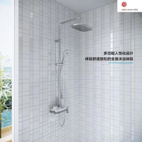 ??打開開關(guān),一抹時尚寧靜的伊奈藍便隨之浮現(xiàn)。置物臺與水管連接處的弧形設(shè)計采用伊奈特有的“火山形”設(shè)計元素,水流自然落下,不易沉積水漬,切換后輕松實現(xiàn)頂噴和手持花灑的切換,享受不同水流帶來的舒爽沐浴體驗。