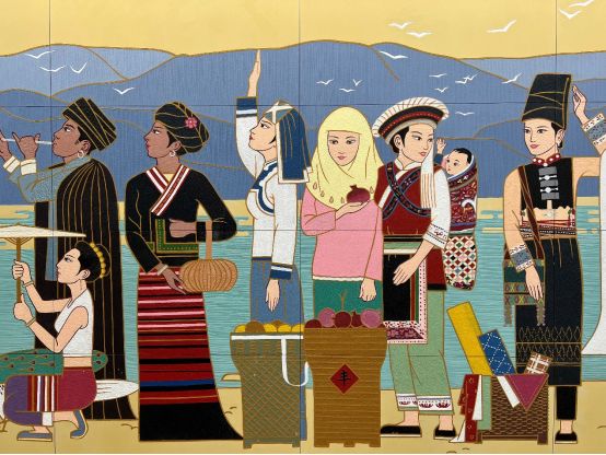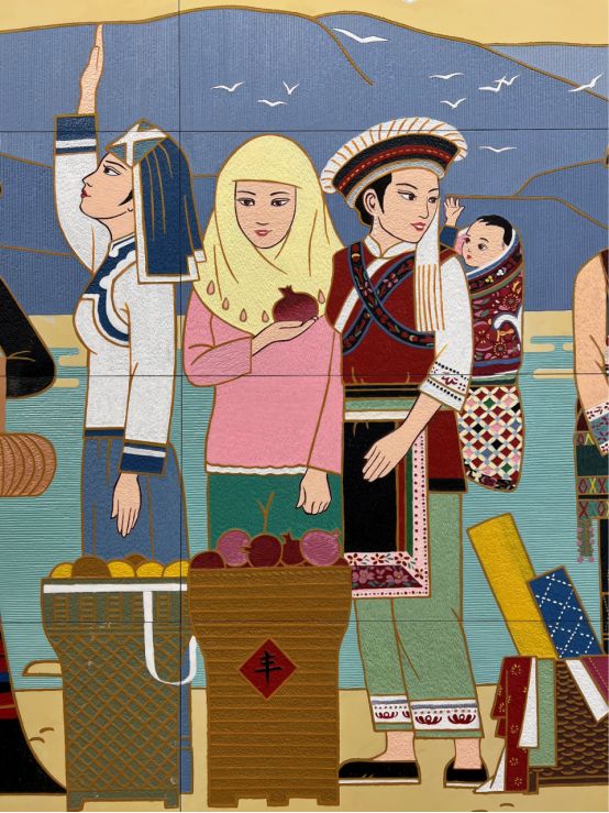 ??本幅作品色彩豐富,原稿針對(duì)主畫(huà)面人物身上穿著的各式民族服飾使用了不同的色塊進(jìn)行區(qū)分,而在馬可波羅文化陶瓷上,工藝師加上了不同的刀法來(lái)展示,讓作品層次更加豐富。背景中的海鷗,還采用了陰陽(yáng)刻相結(jié)合的手法,近距離觀看藝術(shù)壁畫(huà)的細(xì)節(jié),更能感受到手工雕刻精細(xì)而傳神的魅力。