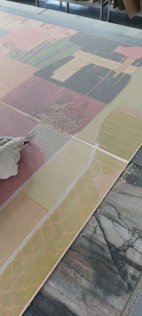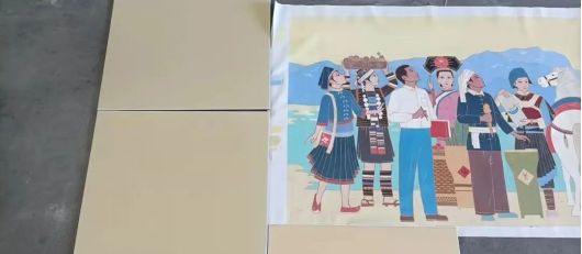 ??精益求精 于細(xì)節(jié)處顯匠心 ??要在地鐵站中應(yīng)用文化陶瓷,既需要滿足施工時(shí)對(duì)于安全的性能要求,也要滿足能夠完美重現(xiàn)作品的藝術(shù)表現(xiàn)力。 ??為此,馬可波羅文化陶瓷特別定制了一款600×1200mm 的黃色面釉磚作為作品平面的底色,既符合原作的色系,又豐富了顏色的層次,讓作品既有平面釉色,又有雕刻后繪制的其他顏色。
