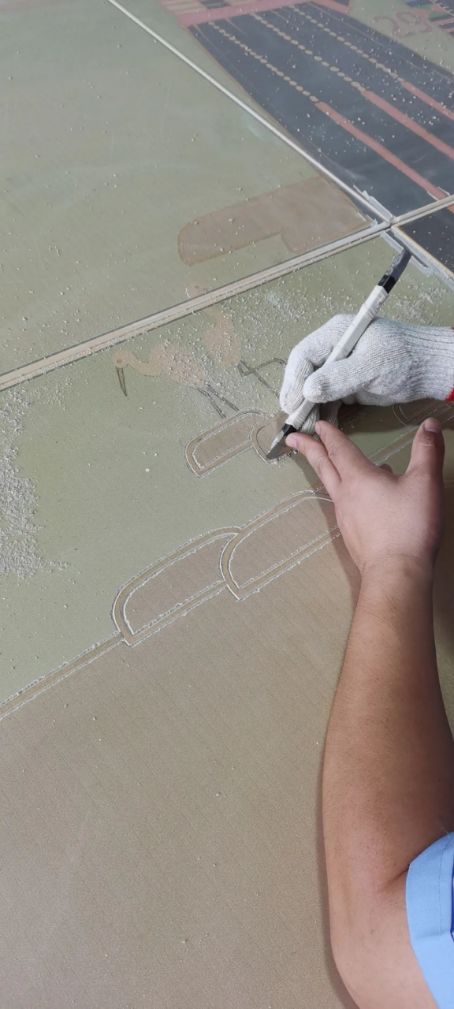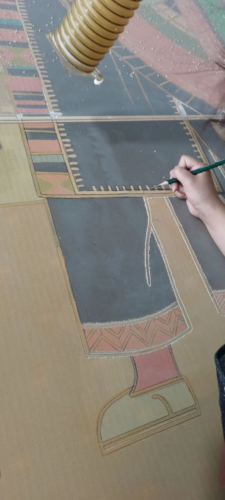 ??作品生產(chǎn)過(guò)程中,因原稿尺寸較小,放大后還要對(duì)一些細(xì)節(jié)進(jìn)行再次深化。工藝師們用鉛筆在磚坯上二次創(chuàng)作,豐富內(nèi)容,然后進(jìn)行雕刻,保障作品的藝術(shù)表現(xiàn)力。