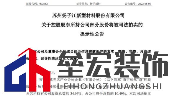 | 8月3日晚間,揚(yáng)子新材(002652.SZ)公告稱,控股股東南寧頤然養(yǎng)老產(chǎn)業(yè)合伙企業(yè)(有限合伙)(以下簡(jiǎn)稱“南寧頤然”)所持公司部分股份將被執(zhí)行司法拍賣,執(zhí)行拍賣的數(shù)量為5370萬股,占其所持有公司股份總數(shù)的34.96%,占公司股份總數(shù)的10.49%。  本次股份拍賣,起因是大連銀行上海分行與南寧頤然等金融借款合同糾紛一案引發(fā)的凍結(jié)拍賣一事。本次司法拍賣事項(xiàng)不會(huì)導(dǎo)致公司控制權(quán)發(fā)生變更,不會(huì)對(duì)公司的正常生產(chǎn)經(jīng)營(yíng)產(chǎn)生重大影響。 截止8月3日,南寧頤然持有公司153,600,000股股份,占公司股份總數(shù)的30%;累計(jì)被凍結(jié)股份81,239,573股,占其持有公司股份總數(shù)的 52.89%,占公司股份總數(shù)的 15.87%。本次被司法拍賣股份合計(jì)53,700,000股,占其持有公司股份總數(shù)的34.96%,占公司股份總數(shù)的 10.49%。 出品:搜狐焦點(diǎn)家居 |