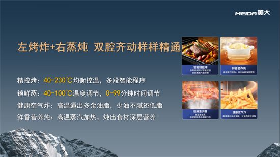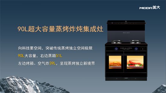 90L大容量 重塑大膽空間,包容百變風(fēng)味 在洞察多元烹飪需求場景下,美大新品風(fēng)華系列蒸烤炸燉集成灶超大內(nèi)膽設(shè)計在1㎡內(nèi)玩轉(zhuǎn)空間,突破傳統(tǒng)蒸烤獨立集成灶容量小的空間限制,美大在內(nèi)膽空間上升級研發(fā),大膽擴(kuò)容,搭載90L超大容量,左烤炸51L+右蒸燉39L,雙腔齊動樣樣精通,把烹飪所需充分囊括,高效烹飪無需等待。美大風(fēng)華蒸烤炸燉集成灶,以超大內(nèi)膽,探索更多功能組合;秉創(chuàng)新集成,筑就烹飪新境界;方寸蒸烤領(lǐng)略科技演繹空間的烹飪藝術(shù)。兩個人的三菜一湯不在話下,全家歡聚團(tuán)圓時刻從容不迫,升階詮釋集成空間,重塑空間與時間的美感,享受多元烹飪自由。