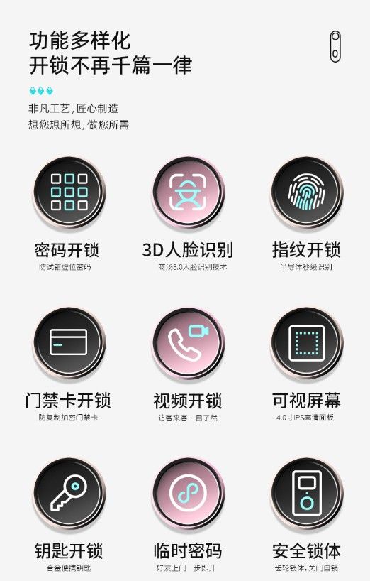 ??此外,在功能方面,匯泰龍“彤心鎖”還集合了3D人臉識(shí)別、可視對(duì)講解鎖、密碼開(kāi)鎖、指紋開(kāi)鎖、視頻開(kāi)鎖、臨時(shí)密碼等8種方式,為人們帶來(lái)了更好的家居安全守護(hù)和智能家居體驗(yàn)。人臉識(shí)別功能采用的是3D雙目仿生人臉識(shí)別技術(shù),搭配BCTC金融級(jí)人臉?biāo)惴?,不管是無(wú)光、暗光或背光等任何環(huán)境,都可秒速識(shí)別,帶妝和佩戴飾品等情況也無(wú)任何影響。