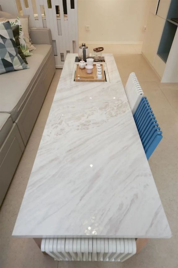 ??設(shè)計師秦岳明及團隊充分了解房屋結(jié)構(gòu)后,立即討論設(shè)計出改造方案。在來到馬可波羅瓷磚門店參觀產(chǎn)品和樣板間后,秦老師決定采用馬可波羅巖板為榜樣人物打造溫暖親切的生活空間。 ??榜樣人物本就有喝茶的習(xí)慣,設(shè)計師選用防刮耐磨、防污易清潔、耐酸堿腐蝕的馬可波羅巖板白金沙定制巖板茶桌,更讓王蘭蘭日常招待來客或是用餐打掃輕松省心。 ??此外,裝修客餐廳、臥室和衛(wèi)生間還分別采用了馬可波羅巖板極巖杏、意大利石松和大板莫蘭迪。柔和的色調(diào)搭配、舒適溫馨的空間氛圍獲得了榜樣人物的滿意和認可。 ??改造后