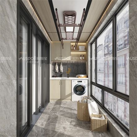 ??05陽(yáng)臺(tái)篇 ??將陽(yáng)臺(tái)區(qū)打造晾曬空間,晾衣機(jī)嵌入在陽(yáng)臺(tái)吊頂當(dāng)中,除了基本的晾曬功能,它還集合殺菌消毒、烘干、風(fēng)干、自動(dòng)升降、照明、無(wú)線(xiàn)遙控等多功能于一體。 ??使用定制陽(yáng)臺(tái)柜,日曬雨淋都不怕,開(kāi)放柜與吊柜結(jié)合,洗衣機(jī)與定制陽(yáng)臺(tái)柜結(jié)合,提供了充分的收納空間,家居收納不再成問(wèn)題。
