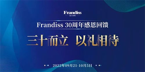 ??Frandiss(富蘭帝斯)三十周年之際 ??將舉行三十周年感恩回饋以及FB新品品鑒活動(dòng) ??本次活動(dòng)將于9月21日-10月5號(hào) ??活動(dòng)以“而立,以禮相待”為主題 ??多重豪禮,超低折扣 ??感謝大家一直以來對(duì)富蘭帝斯的支持與厚愛 ??同時(shí)也將揭開FB新品的神秘面紗 ??帶來一場(chǎng)視覺上的饕殄盛宴 ??FB新品亮相,流光魅影 傾啟奢適 ??高端家居真正的意義 ??在于每一個(gè)經(jīng)得起細(xì)節(jié)考究的挑剔 ??在于其蘊(yùn)含獨(dú)有的非凡氣質(zhì) ??在于細(xì)節(jié)到紋理中的設(shè)計(jì) ??個(gè)性前衛(wèi),匠心藝術(shù) ??穿越曠野,尋覓內(nèi)心的真粹遐想, ??帶著對(duì)生命的敬畏,回歸自然 ??多種元素的碰撞與融合真正的顛覆之作 ??彰顯個(gè)性前衛(wèi)的生活主張 ??藍(lán)灰的色調(diào)里流淌著沉靜和美得貴族氣質(zhì) ??色彩的張力感,讓意象更為恢弘氣派 ??圓弧設(shè)計(jì)以殿堂為中心聚攏 ??有聚勢(shì)納財(cái)之意 ??蘊(yùn)藏著無限延伸之感 ??拉絲黃銅凸顯高貴氣質(zhì) ??優(yōu)雅的弧度線條 ??透露著典雅與端莊 ??頭層牛皮,舒適有品 ??觸感如同嬰兒肌膚般順滑 ??一筆一線精密車縫,成就毫厘之間的卓然美態(tài) ??以匠心藝術(shù),致敬經(jīng)典之作