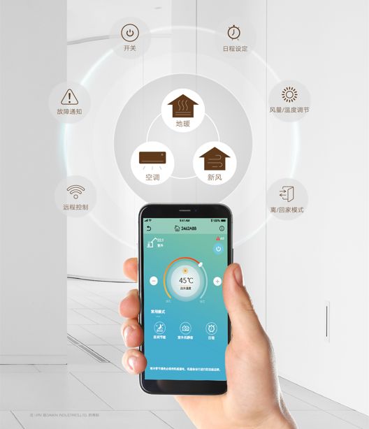 ??大金空調能夠為每個人的家提供個性化選擇,這得益于大金空調豐富的產品線及多樣的產品功能,大金研發(fā)了針對客廳、臥室、兒童房、廚房、衛(wèi)生間、衣帽間、書房等各個空間的空調室內機,能夠滿足不同空間的功能性需求,特殊的廚房、衛(wèi)浴空間也能擁有無油煙、不潮濕的空氣體驗。 ??同時,大金全新推出了中央空調+新風+地暖智聯一體的舒適系統(tǒng),夏天用空調,清涼無風感;冬天用地暖,溫暖又舒適。值得一提的是,大金地暖采用空氣源熱泵技術,利用少量電量和免費空氣能,獲得4倍溫暖*,對比常見燃氣鍋爐,費用節(jié)省率最高可達53%*1。 ??全屋空氣智能互聯 實現更高生活品質