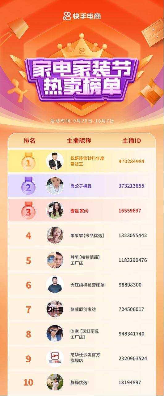 | ??10月12日消息,快手電商家電家裝節(jié)隨著國(guó)慶假期結(jié)束圓滿收官,此次家電家裝節(jié)共促成GMV超5.5億,同比去年增長(zhǎng)了30%。參與活動(dòng)的家具、家居、家紡、家電等垂直行業(yè)商家均取得了優(yōu)異的大促成績(jī),家紡行業(yè)商家達(dá)成GMV超2.7億,家電行業(yè)商家達(dá)成GMV同比增長(zhǎng)了75%。 ??其中,祝哥裝修材料、尚公子棉品、雪姐家紡、果果家、勝男【梅特德菲】工廠店登上了熱賣榜前五,品牌商家芝華仕也擠進(jìn)了熱賣榜前十。
