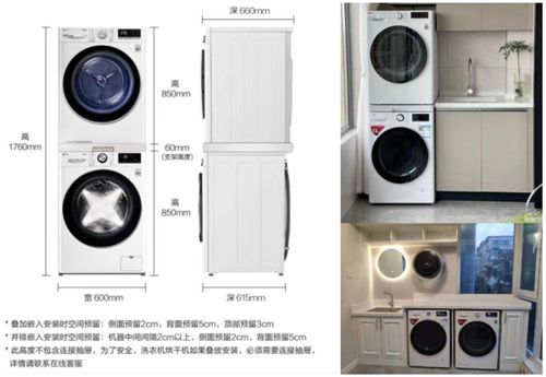 LG洗烘套裝外觀采用簡約時尚的白色,無論是什么樣的家居風格都能輕松駕馭。可以搭配使用也能單獨運行,專機專用,特別方便。而且擺放靈活,可以上下疊放,也可以并排擺放。 洗衣機與干衣機的尺寸分別為:600mm*615mm*850mm和600mm*660mm*850mm(長寬高順序),對于居住面積較小的家庭來說,它們可以上下疊放,空間利用率更高。