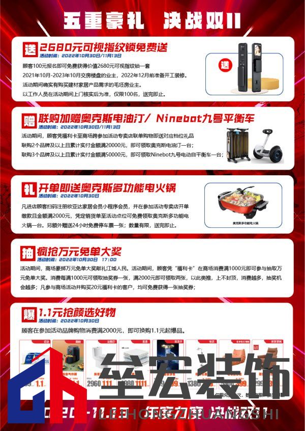 雙十一用實惠的價格和高品質(zhì)家居助力每一個消費者完成家居計劃,展現(xiàn)出歐亞達光谷商場及各大品牌活力,并聯(lián)合裝修工長、知名設(shè)計師和新浪家居媒體資源,共同為消費者謀福利,一年一次,值得擁有! 歐亞達光谷商場福利大放送??