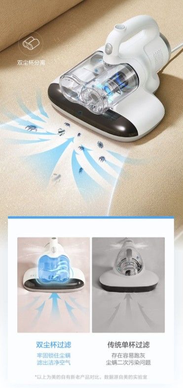 ??美的除螨儀強勢破局,強力除螨引領(lǐng)行業(yè)技術(shù)革新 ??除螨儀作為吸塵器核心技術(shù)的延伸,一直以來,核心技術(shù)都被戴森為首的歐美品牌占領(lǐng)技術(shù)高地。而吸力,則是戴森的殺手锏。然而消費者為了除螨,卻要付4990元購買戴森吸塵器當除螨儀用,上千的價格讓消費者望而卻步,加上外國品牌技術(shù)的封鎖,讓國產(chǎn)除螨儀發(fā)展陷入技術(shù)桎梏。 ??美的在技術(shù)上勇于創(chuàng)新,敢當“第一個吃螃蟹”的國內(nèi)領(lǐng)軍品牌。在對已有技術(shù)方案進行全面探測對比后,積極需要除螨新的突破點,找到一個有效的技術(shù)路徑,推出多款有效解決螨蟲問題的除螨儀,快速引爆市場。 ??2021年,美的首創(chuàng)行業(yè)內(nèi)擁有高壓電擊概念的除螨儀MX3,通過電擊瞬間產(chǎn)生3000V高壓,電離空氣產(chǎn)生負離子,負離子和細菌、螨蟲、塵埃結(jié)合,在有效殺死螨蟲的同時,還能凈化空氣,被評為2021年度家電“好產(chǎn)品”代表。 ??如今,美的在MX5上推出全新一代除螨核心技術(shù)高壓電擊+雙杯過濾,徹底變革了純比拼吸力的時代,實現(xiàn)了除螨儀數(shù)十年歷史中的跨越式創(chuàng)新。 ??創(chuàng)新雙杯塵設(shè)計,分濾塵螨潔凈不跑灰 ??除螨儀從核心結(jié)構(gòu)來講是個小吸塵器,吸塵器一大痛點是長期使用后由于灰塵堵塞濾芯導致吸力大幅度下降。