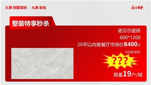 諾貝爾瓷磚,600*1200,20平方以內(nèi)客餐廳市場(chǎng)價(jià)8400元,今日秒殺價(jià)???元(限量19戶/城)