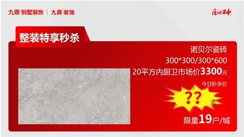 諾貝爾瓷磚300*300/300*600,20平方內(nèi)廚衛(wèi)市場(chǎng)價(jià)3300元,今日秒殺價(jià)??元(限量19戶/城)