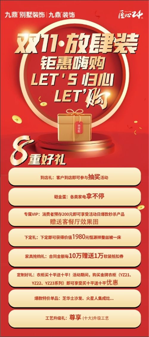 24年來(lái),九鼎裝飾立足浙江,自成立以來(lái),九鼎裝飾秉持“口碑相傳,永續(xù)經(jīng)營(yíng)”的理念,堅(jiān)持匠心精神,以優(yōu)秀的設(shè)計(jì)、嚴(yán)格的管理、精湛的工藝、環(huán)保的材料和真誠(chéng)的服務(wù),讓每一位客戶都享受到獨(dú)特而快樂(lè)的裝修之旅。 “雙十一.放肆裝”百城聯(lián)動(dòng)到來(lái)之際,九鼎裝飾總部將聯(lián)合全國(guó)各城市公司隆重推出雙11鉅惠慶典,以勁爆活動(dòng)答謝您一路來(lái)的不離不棄。 八重好禮鉅惠享不停 到店禮:客戶到店即可參與抽獎(jiǎng)活動(dòng) 砸金蛋:各類(lèi)家電拿不停 專(zhuān)屬VIP:消費(fèi)者預(yù)存200元即可享受活動(dòng)日爆款秒殺產(chǎn)品 贈(zèng)送客餐廳效果圖 下定禮:下定即可獲得價(jià)值1980元恒源祥蠶絲被一床 家具搶購(gòu)禮:合同金額每日一題萬(wàn)贈(zèng)送1萬(wàn)軟裝抵扣券 定制好禮:衣柜買(mǎi)十平送十平!活動(dòng)期間,購(gòu)買(mǎi)金牌衣柜(YZ21、YZ22、YZ23系列)即可享受買(mǎi)十平送十平優(yōu)惠 爆款特價(jià)單品:芝華士沙發(fā)、火星人集成灶 工藝升級(jí)禮:尊享(十大)升級(jí)工藝