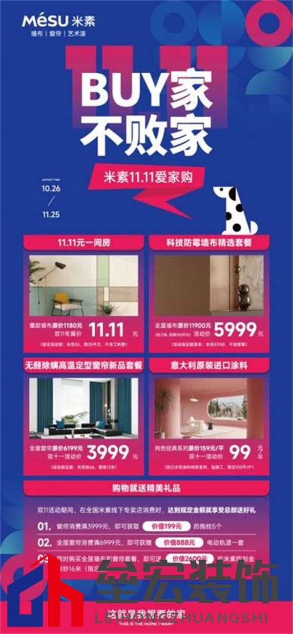 | 一年一度雙十一狂歡季的鐘聲已經(jīng)敲響,又是一波剁手“敗家”的風暴來襲。買買買雖然很快樂,但在壓力倍增的當下,省錢已然成為一門學問,用更少的錢買到更好的東西,顯然能夠帶來更大的快樂。選對正確血拼姿勢,不熬夜、不吃土、拒絕盲目剁手敗家,搶占BUY家優(yōu)惠福利,今年雙十一,米素軟裝讓你“BUY家不敗家”。10.26—11.25,米素“11.11愛家購”活動火熱進行,帶你打開全新買買買模式!