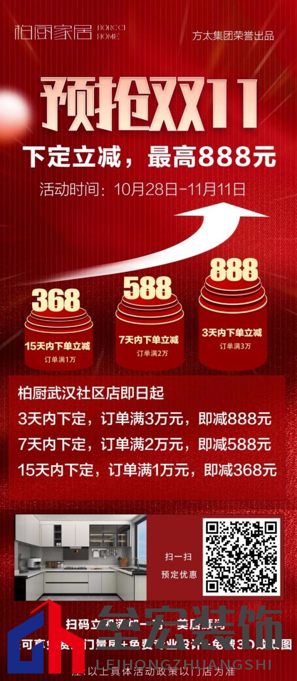 江城四店整齊出道,雙11狂歡搶好禮! 驚爆特惠福利讓你BUY家不敗家! 武漢柏廚有何福利?柏粉看這里! ↓↓↓↓↓↓ 預(yù)搶雙11 下定立減(雙十一優(yōu)惠活動可疊加) 想要優(yōu)惠要趁早!不搞套路,簡單粗暴,直接滿減! 定制家具,線上下定立享滿減,最高直減888元! 盡享武漢柏廚社區(qū)店“出道福利”?。?!