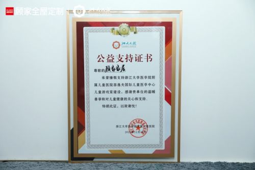 ??此次顧家家居對(duì)于醫(yī)院游戲室的公益支持打造以及公益關(guān)愛行動(dòng),獲得了醫(yī)院的認(rèn)可,也受到小朋友們及家長的歡迎,并榮獲浙江大學(xué)醫(yī)學(xué)院附屬兒童醫(yī)院頒發(fā)的感謝證書。