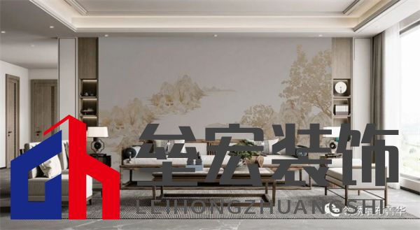 墻面上流暢的寫意山水畫 反映了中式古典風(fēng)采 筆墨交融,構(gòu)建詩情畫意氛圍 兩岸青山 中灰