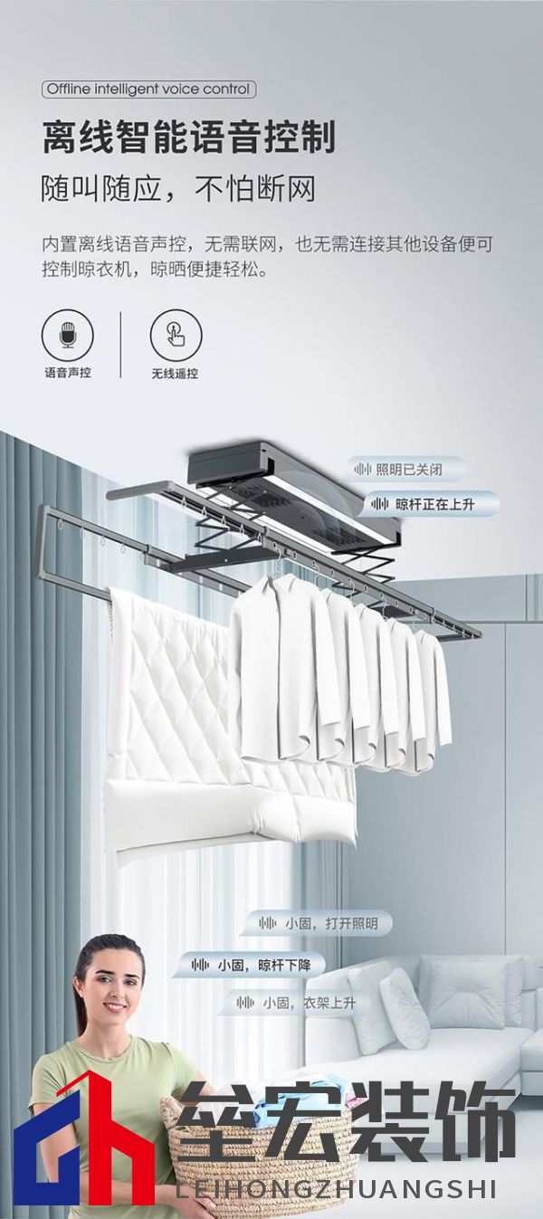 ??離線智能語(yǔ)音控制 ??隨叫隨應(yīng),不怕斷網(wǎng) ??當(dāng)別人還在用撐衣桿,踮起腳來(lái),仰起頭來(lái),辛辛苦苦地,一件一件地晾曬衣服或者收衣服的時(shí)候,你只需要喊一聲:小固小固,晾衣架上升,小固小固,晾衣架下降,就可以輕松完成衣服的晾曬,是不是瞬間覺(jué)得幸福感倍增?頂固D7離線語(yǔ)音晾衣機(jī),內(nèi)置離線語(yǔ)音聲控,無(wú)需聯(lián)網(wǎng),也無(wú)需連接其他設(shè)備便可控制晾衣機(jī),晾曬便捷輕松,從此和傳統(tǒng)的撐衣桿說(shuō)拜拜。