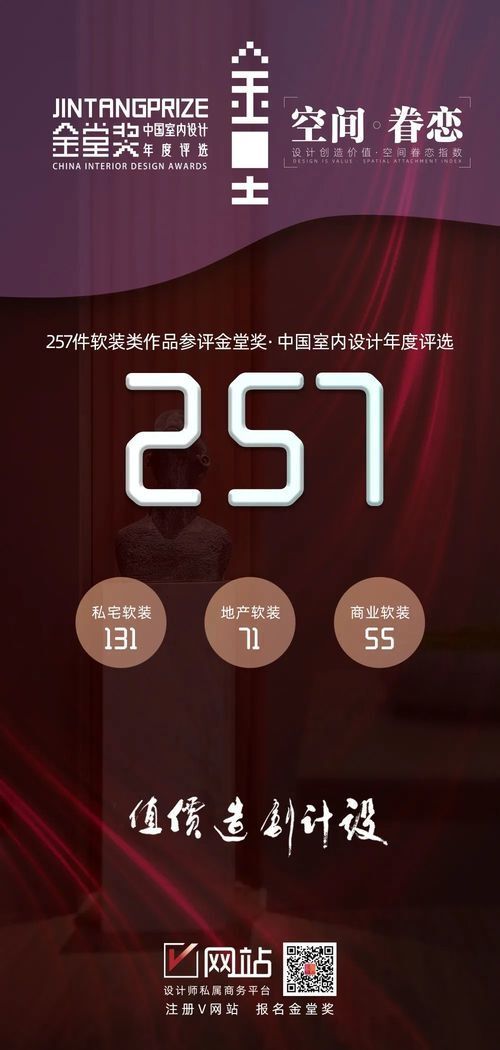 在2022年度,共有257件軟裝類作品報名參評金堂獎,其中私宅軟裝131件,地產(chǎn)軟裝71件,商業(yè)軟裝55件。 隨著中國人民生活水平的不斷提升,軟裝設(shè)計逐漸成為室內(nèi)設(shè)計行業(yè)中的一股新秀力量。軟裝設(shè)計師們熟練地駕馭著光影、材質(zhì)、虛實的變幻,鑄就獨特的美學(xué)體驗,用智慧打造理想人居。 從過往各個年度的軟裝評選中,金堂獎已經(jīng)發(fā)掘出眾多優(yōu)秀的設(shè)計作品,與優(yōu)秀設(shè)計機構(gòu)、設(shè)計師。相信2022年度的金堂獎軟裝類評選,也將繼續(xù)誕生更優(yōu)秀的軟裝設(shè)計作品,為中國設(shè)計的王冠鑲嵌一顆又一顆的明珠。