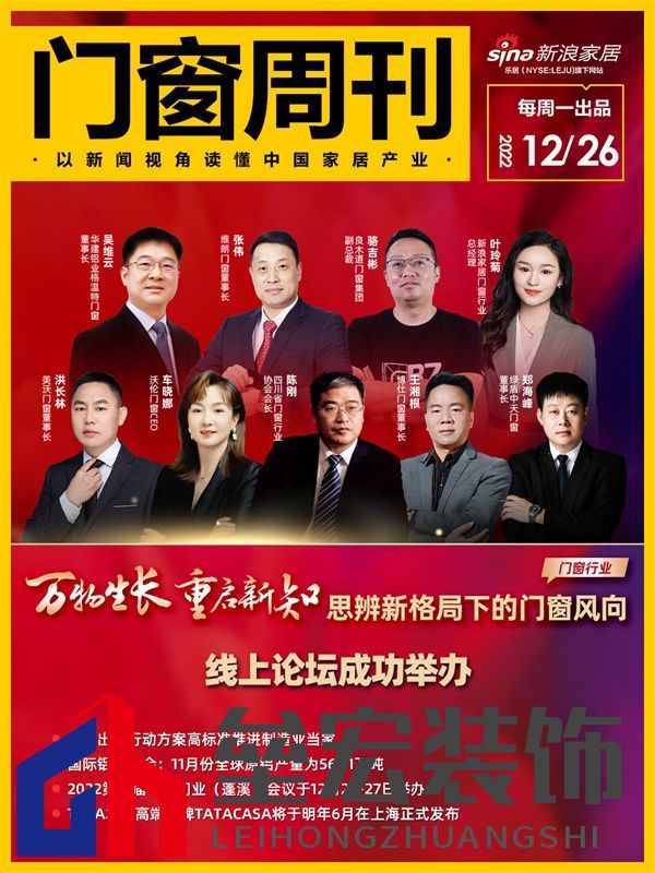 ??“萬(wàn)物生長(zhǎng) 重啟新知——思辨新格局下的門(mén)窗風(fēng)向”線上論壇成功舉辦 ??12月21日,新浪家居特別舉辦“趁勢(shì) ? 再起——2023中國(guó)家居新時(shí)代盛典暨金致獎(jiǎng)?lì)C獎(jiǎng)典禮”系列論壇,“萬(wàn)物生長(zhǎng) 重啟新知——思辨新格局下的門(mén)窗風(fēng)向”線上論壇,邀約四川省門(mén)窗行業(yè)協(xié)會(huì)會(huì)長(zhǎng)陳剛、博仕門(mén)窗董事長(zhǎng)王湘根、維朗門(mén)窗董事長(zhǎng)張偉、沃倫門(mén)窗CEO車(chē)曉娜、美沃門(mén)窗董事長(zhǎng)洪長(zhǎng)林、良木道門(mén)窗集團(tuán)副總裁駱吉彬、華建鋁業(yè)格溫特門(mén)窗董事長(zhǎng)吳維云等一眾中國(guó)門(mén)窗行業(yè)優(yōu)秀企業(yè)家,重新思考、辨別行業(yè)發(fā)展,探尋新的增長(zhǎng)曲線。 ??查看詳情:共襄高質(zhì)量發(fā)展,門(mén)窗大咖云端思辨行業(yè)新風(fēng)向