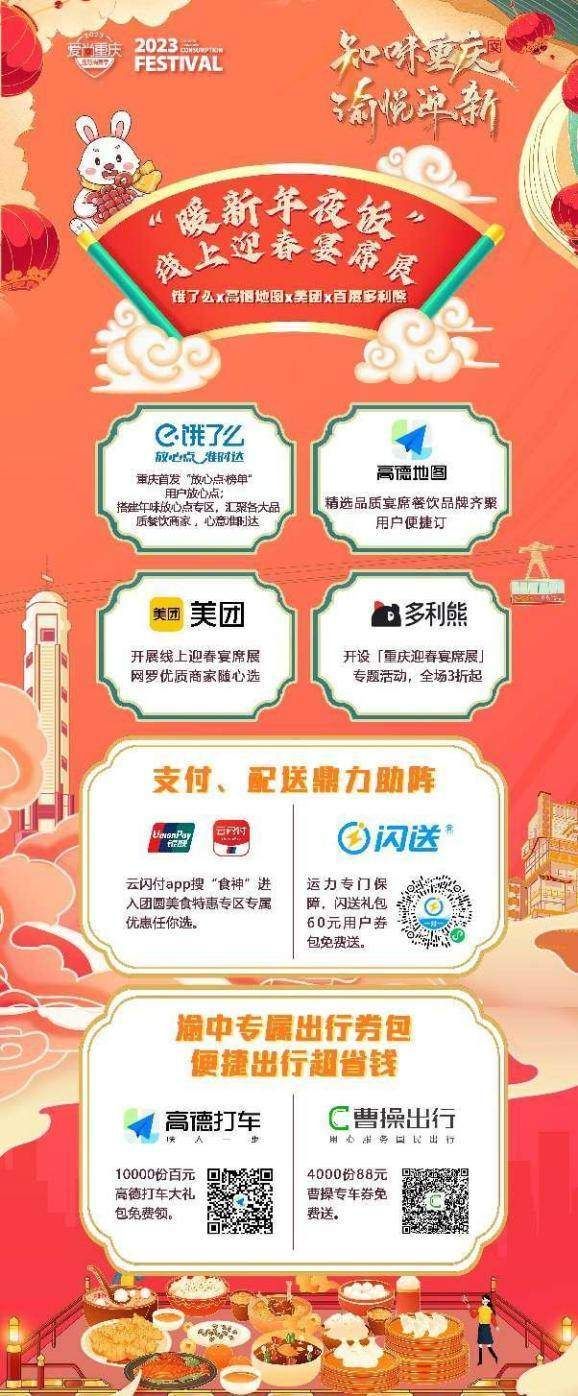 ??為了讓廣大市民朋友們在活動和過年期間,便捷出行,渝中區(qū)商務委更是聯(lián)合曹操出行與高德打車,分別推出價值百元的專屬出行禮包,讓大家出行方便還省錢。 ??點餐平臺、配送平臺聯(lián)袂獻禮 ??線上活動同樣精彩紛呈 ??線下活動熱鬧非凡,線上活動也同樣看點滿滿。餓了么不僅在線上客戶端上線重慶首發(fā)“放心點·榜單”,還搭建年味放心點專區(qū),匯聚各大品質(zhì)餐飲商家 ,心意準時達;高德地圖精選品質(zhì)宴席餐飲品牌齊聚,用戶便捷訂;百度多利熊開設「重慶迎春宴席展」專題活動,全場3折起;美團開展線上迎春宴席展,網(wǎng)羅優(yōu)質(zhì)商家用戶隨心選;云閃付app搜“食神”,進入團圓美食特惠專區(qū),各大美食品牌專屬優(yōu)惠任你選。本次線上各大平臺聚合超過5000家商戶同步線上開展年味放心點、團圓宴團購活動,通過外賣到家、進店以及配套周邊年貨等多形式促進春節(jié)歡聚消費,預估活動期間線上產(chǎn)生宴席套餐交易總訂單超過2萬單。閃送更是推出了針對商家和消費者的兩種特惠禮包,累計出行/配送補貼發(fā)放超過200萬元,讓廣大市民朋友足不出戶、輕松享用團年宴。