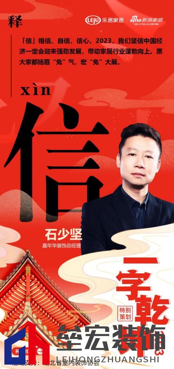 在新浪家居“2023一字乾坤”活動(dòng)中,嘉年華裝飾總經(jīng)理石少堅(jiān):「信」相信、自信、信心。2023,我們堅(jiān)信中國(guó)經(jīng)濟(jì)一定會(huì)迎來強(qiáng)勁發(fā)展,帶動(dòng)家居行業(yè)蓬勃向上。愿大家都揚(yáng)眉“兔”氣,宏“兔”大展。 “以漢字賦能湖北家居企業(yè),彰顯厚積薄發(fā)之力”,以單字抒寫了各家企業(yè)及媒體的新年愿景與發(fā)展信條,領(lǐng)略楚風(fēng)漢韻下湖北家居人砥礪向前,揚(yáng)帆未來的決心與動(dòng)力,情暖兔歲,新啟華章。 |