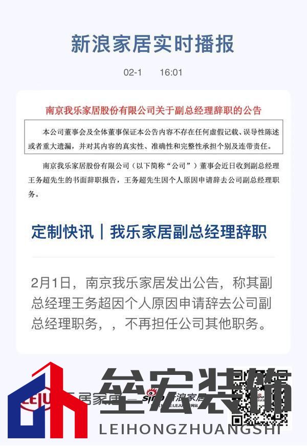 2月1日,南京我樂家居發(fā)出公告,稱其副總經(jīng)理王務(wù)超因個人原因申請辭去公司副總經(jīng)理職務(wù),且不再擔(dān)任公司其他職務(wù)。