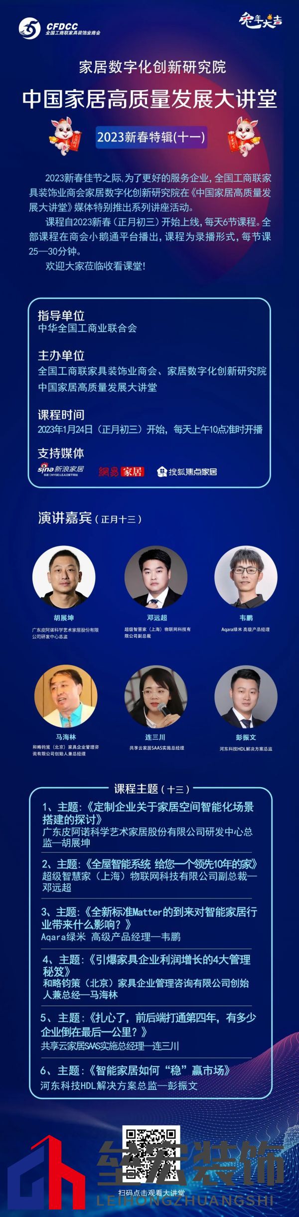 | ??值此新春佳節(jié)之際,由全國工商聯(lián)家具裝飾業(yè)商會家居數(shù)字化創(chuàng)新研究院主辦的2023“中國家居高質(zhì)量發(fā)展大講堂”于正月初三上午10點正式上線播出!《中國家居高質(zhì)量發(fā)展大講堂》自2022年春節(jié)推出以來,深受行業(yè)的好評,最多時一場十幾萬人在線收看。 ??今年的大講堂課程設(shè)計,密切結(jié)合家居行業(yè)實際,選擇行業(yè)亟待解決的、重點關(guān)注的、對行業(yè)發(fā)展具有深刻影響的內(nèi)容,特別邀請行業(yè)專家授課,包括了四大熱點主題:數(shù)字化轉(zhuǎn)型案例分享、元宇宙技術(shù)與應(yīng)用、家居整裝與供應(yīng)鏈、智能家居技術(shù)講座。 ??正月十三的演講主題如下圖,歡迎大家掃描二維碼收看課堂!