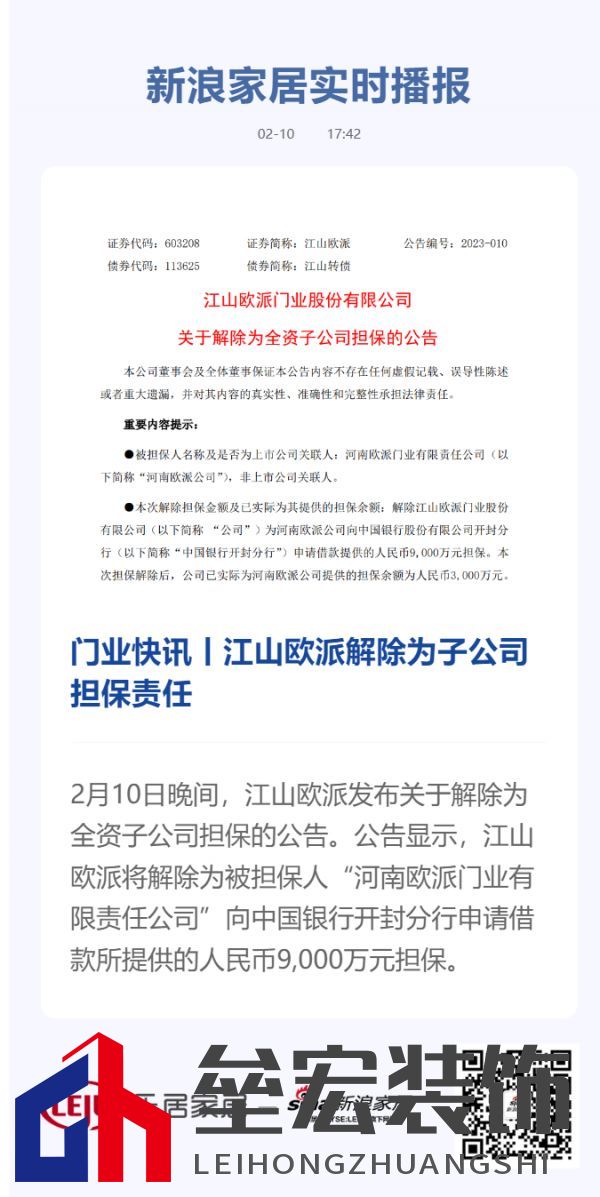 ??2月10日晚間,江山歐派發(fā)布關(guān)于解除為全資子公司擔(dān)保的公告。公告顯示,江山歐派將解除為被擔(dān)保人“河南歐派門業(yè)有限責(zé)任公司”向中國(guó)銀行開封分行申請(qǐng)借款所提供的人民幣9,000萬(wàn)元擔(dān)保。