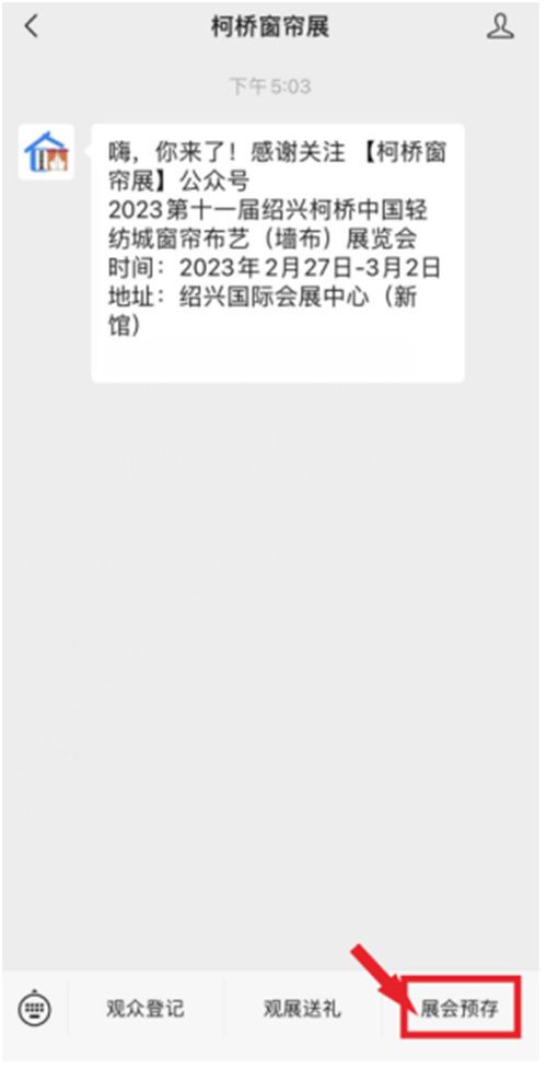 1、微信搜索“柯橋窗簾展”公眾號(hào),進(jìn)入公眾號(hào)首頁 2、點(diǎn)擊下方“展會(huì)預(yù)存” 展會(huì)活動(dòng)三: 展會(huì)邀客推薦官 邀請(qǐng)周邊小伙伴共同參與 做觀展邀客推薦官 關(guān)注“柯橋窗簾展”公眾號(hào)了解詳情