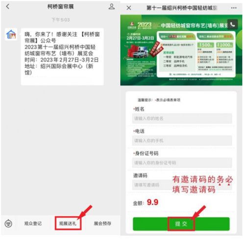 時(shí)間:2月27日-3月2日 地址:紹興國際會(huì)展中心(新館) 主題:三鏈·一態(tài)·一基地 展品范圍:涵蓋窗簾、窗紗、窗飾、成品簾、輔料、墻紙墻布、墻飾墻咔、地毯、沙發(fā)布、床上用品、成品加工機(jī)械、配套包裝設(shè)計(jì)、整體家居軟裝等。 展會(huì)活動(dòng)一: 報(bào)名觀展送好禮 9.9元報(bào)名觀展 1、送超值精美觀展禮品1份 2、送抽獎(jiǎng)名額1個(gè) 報(bào)名觀展抽大獎(jiǎng) 獎(jiǎng)項(xiàng)設(shè)置 一等獎(jiǎng):新能源電動(dòng)汽車 二等獎(jiǎng):品牌手機(jī) 三等獎(jiǎng):品牌掛燙機(jī) 報(bào)名抽獎(jiǎng)流程 1、微信搜索“柯橋窗簾展”公眾號(hào),進(jìn)入公眾號(hào)首頁 2、點(diǎn)擊下方“觀展送禮”