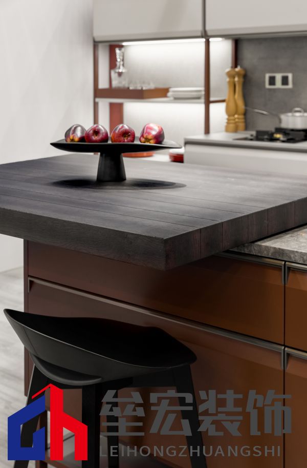 ??鐵銹紅烤漆的中島島臺門板設計保持了統(tǒng)一的線性設計思路,其上搭配Nabuk橡木實木貼皮Diagonal可斜拉式臺面系統(tǒng),配合廚房島臺可充分延展臺面作為操作臺和餐吧臺,營造出溫馨的居家烹飪和生活氛圍。