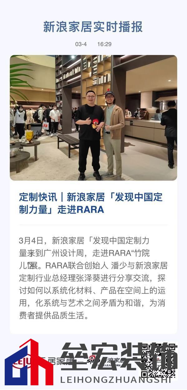 ??新浪定制家居訊 3月4日,新浪家居「發(fā)現(xiàn)中國定制力量 」來到廣州設(shè)計(jì)周,走進(jìn)RARA“竹院兒”展區(qū) 。RARA聯(lián)合創(chuàng)始人 潘少與新浪家居定制行業(yè)總經(jīng)理張澤葵進(jìn)行分享交流,探討如何以系統(tǒng)化材料、產(chǎn)品在空間上的運(yùn)用,化系統(tǒng)與藝術(shù)之間矛盾為和諧,為消費(fèi)者提供品質(zhì)生活。