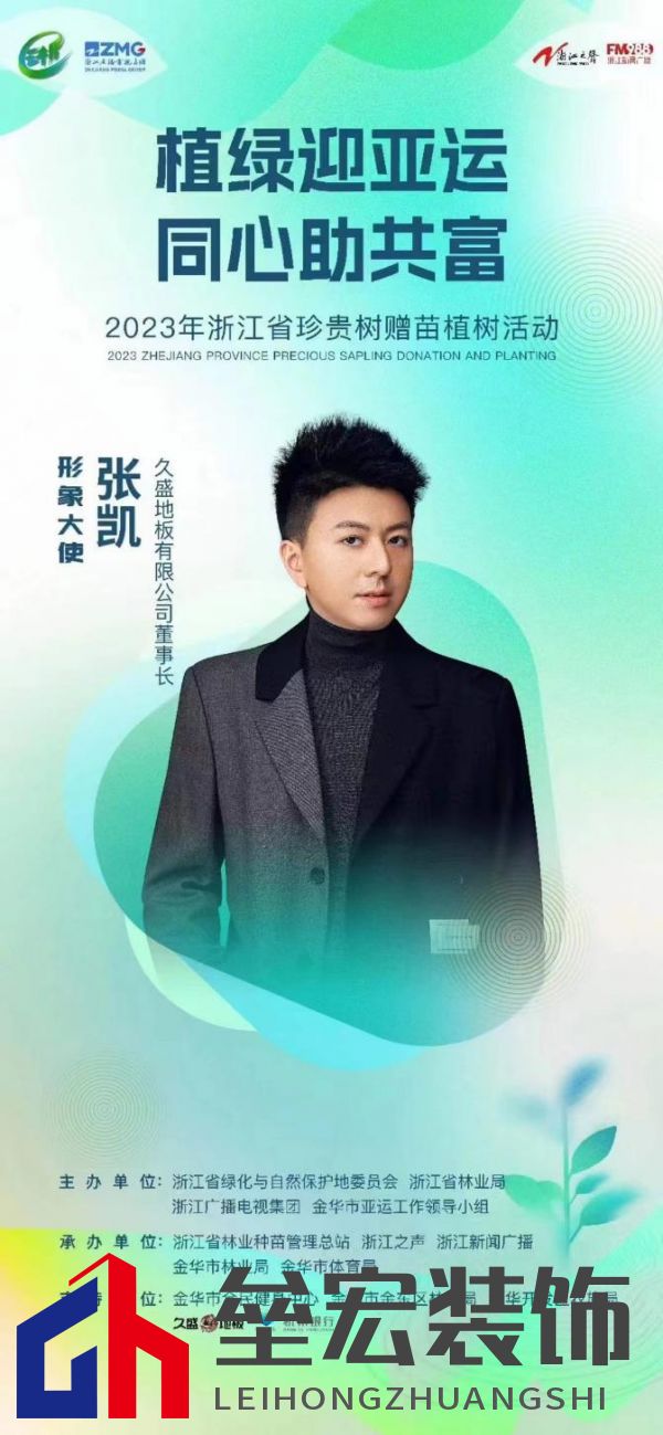 ??活動受到了社會各界廣泛關(guān)注,久盛地板董事長兼總裁張凱先生特邀出席,并與皮劃艇世界冠軍許亞萍、浙江衛(wèi)視主持人王帥、浙江之聲主播方雨、全國十大苗木經(jīng)紀人金華世軒園林董事長程偉達等4位嘉賓被授予2023年全省珍貴樹贈苗植樹活動形象大使稱號。隨后張凱先生宣讀了倡議書,向社會呼吁:“栽下一棵樹苗,成就一片綠色;以實際行動踐行杭州亞運會‘綠色、智能、節(jié)儉、文明’的辦會理念,共同助力亞運會碳中和?!?/p>