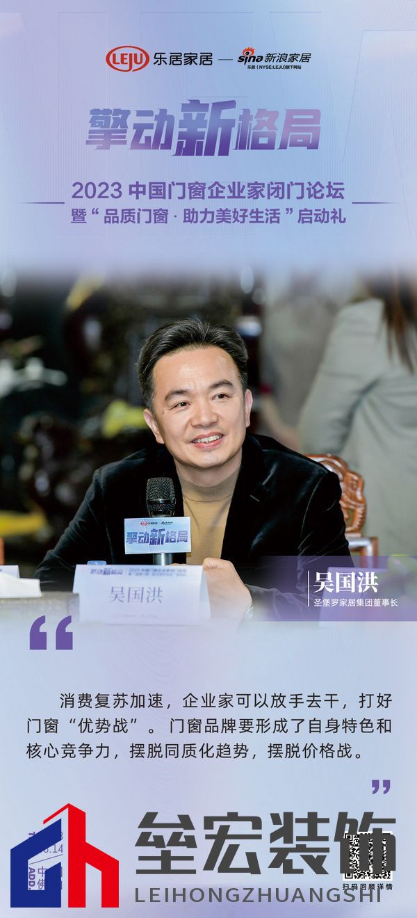 | ??新浪門窗頻道訊 3月14日,“擎動新格局”2023中國門窗企業(yè)家閉門論壇暨“品質(zhì)門窗·助力美好生活”啟動禮在中國佛山舉行。由新浪家居門窗行業(yè)總經(jīng)理葉玲菊主持,圍繞行業(yè)發(fā)展趨勢,與新浪家居總經(jīng)理冀靜、新豪軒門窗董事長馮文波、派雅門窗董事長李鈞洪、皇派門窗董事長朱福慶、軒尼斯門窗總裁曾慶偉、億合門窗董事長曾奎、圣堡羅家居集團董事長吳國洪、百利瑪門窗董事長黃維壽、德技優(yōu)品門窗董事長雷少軍、富軒全屋門窗董事長李昌安、博仕門窗董事長王湘根、高登鋁業(yè)集團執(zhí)行總裁李婧、歐迪克門窗董事長冷洪熙、富奧斯門窗副董事長賀杰雄、美沃門窗董事長洪長林、伊盾門窗董事長張龍偉、榮高門窗董事長黃榮高、漢獅百葉董事長鄧揚禮、薩洛凱門窗董事長吳國強、美詩固門窗董事長詹緬陽、新豪軒門窗總裁馮佐星、新標家居集團總裁助理黃子鋒、阿爾卑斯系統(tǒng)門窗總經(jīng)理常寶琛、金凱德門窗總經(jīng)理代超等,20+中國門窗行業(yè)優(yōu)秀企業(yè)家,展開一場集深度、高度、廣度、熱度的私享交鋒,為行業(yè)高質(zhì)量發(fā)展獻言獻策。