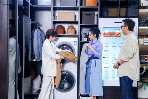 體驗完新一代廚房,丁丁張?zhí)岢龈叨嗣媪想y以護理的問題,而方齡現(xiàn)場為她們推薦了卡薩帝洗衣機。三人走進衣帽間,高葉將一件羊毛面料的衣物放進洗衣機后,通過“養(yǎng)護空氣洗”的護理很快恢復了柔順質(zhì)感和最初色彩。“被安利到了,這個功能不錯,還不用水洗!”對于經(jīng)常換裝、出席活動的高葉來說,高端面料衣物多、換衣勤,而卡薩帝洗衣機能讓她輕松擁有精致生活。 來到智慧客廳,三人坐在沙發(fā)上暢聊女性話題,體驗居家時光的愜意和舒適。在冰吧中取出水果、飲品,一句話喚醒空調(diào),可以體驗到適合每個人的專屬空氣,同時享受一場影院級音畫效果的電影。隨后在插花、泡茶的間隙,高葉還分享了她日常起居時的放松方式,泡澡時放音樂,配合香薰精油按摩……這些方式不但有效改善睡眠,更讓她舒適享受完美的一天。而卡薩帝熱水器、烘干機等卡薩帝家電都能幫助她們及時發(fā)現(xiàn)藏在生活里的美。