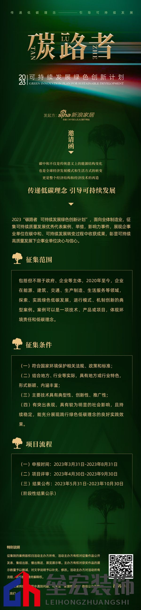 ??啟動儀式上,新浪家居主編陳婉璟女士對“碳路者 2023可持續(xù)發(fā)展綠色創(chuàng)新計劃”的申報流程、相關規(guī)則進行了講解。此次新浪家居“碳路者 可持續(xù)發(fā)展綠色創(chuàng)新計劃”征集范圍,包括但不限于政府、企業(yè)等主體,2020年至今在能源、建筑、交通、生產(chǎn)制造、生活服務等領域,探索、實踐綠色低碳發(fā)展,進行模式、機制創(chuàng)新的典型案例。案例可以是一項技術、產(chǎn)品或項目,體現(xiàn)環(huán)境責任和低碳理念。申報時間從2023年3月1日到2023年8月31日,結果將在2023年5月31日-2023年10月30日期間,陸續(xù)公布。申報單位可以關注家居情報站微信公眾號回復“低碳案例征集”獲取報名表下載并填寫相關內(nèi)容,加上影像圖片等附件資料,以“××單位綠色低碳案例”為郵件名,將申報材料打包發(fā)送至郵箱:158418735@qq.com進行報名,也可以通過掃描下方圖片二維碼在線提報報名。