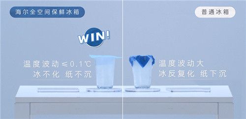 冷凍室溫度是否波動,是造成兩張餐巾紙巨大差異的主要原因。海爾全空間保鮮冰箱的冷凍溫度波動≦0.1°C,冰杯不會反復(fù)化凍,紙巾始終干燥;而普通冰箱冷凍溫度波動大、溫差大,所以導(dǎo)致冰塊反復(fù)化凍,紙巾浸濕下沉。